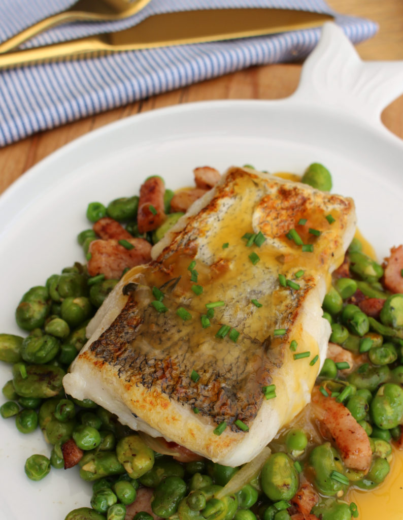 6. To serve, plate up the lardons & greens, place the hake on top and pour over the sauce, garnish with some chopped chives & enjoy!
