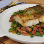 6. To serve, plate up the lardons & greens, place the hake on top and pour over the sauce, garnish with some chopped chives & enjoy!